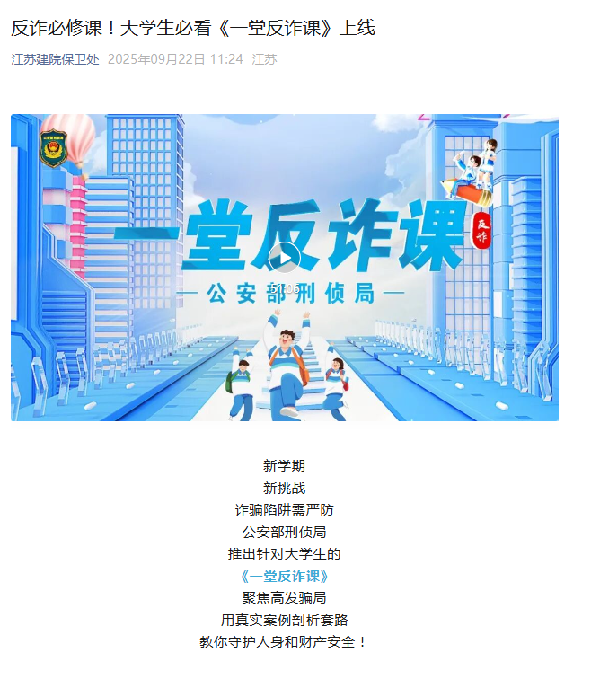 在宣传方式上,采取了线上线下相结合的模式。线下宣传方面,在主要教学区精心布置了反诈主题展板,并在教学楼宇电子显示屏循环播放反诈宣传视频。线上宣传方面,通过官方微信公众号平台推送反诈知识,同时通过公众号平台向学生家长发布《致大学生家长的反诈宣传一封信》,构建起家校协同的反诈防线。