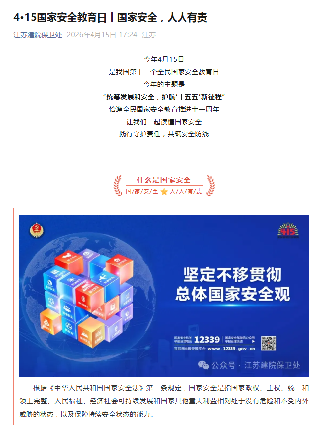 2026年4月15日是第十一个全民国家安全教育日,主题为“统筹发展和安全 护航‘十五五’新征程”。为深入学习贯彻总体国家安全观,落实《关于全面加强国家安全教育的意见》要求,我校保卫处立足岗位职责,结合实际、务求实效,开展了一系列国家安全教育宣传活动。